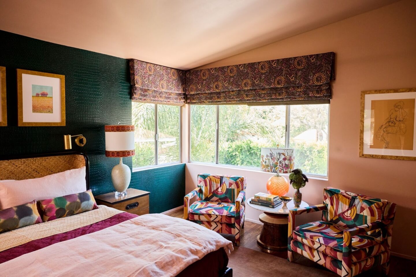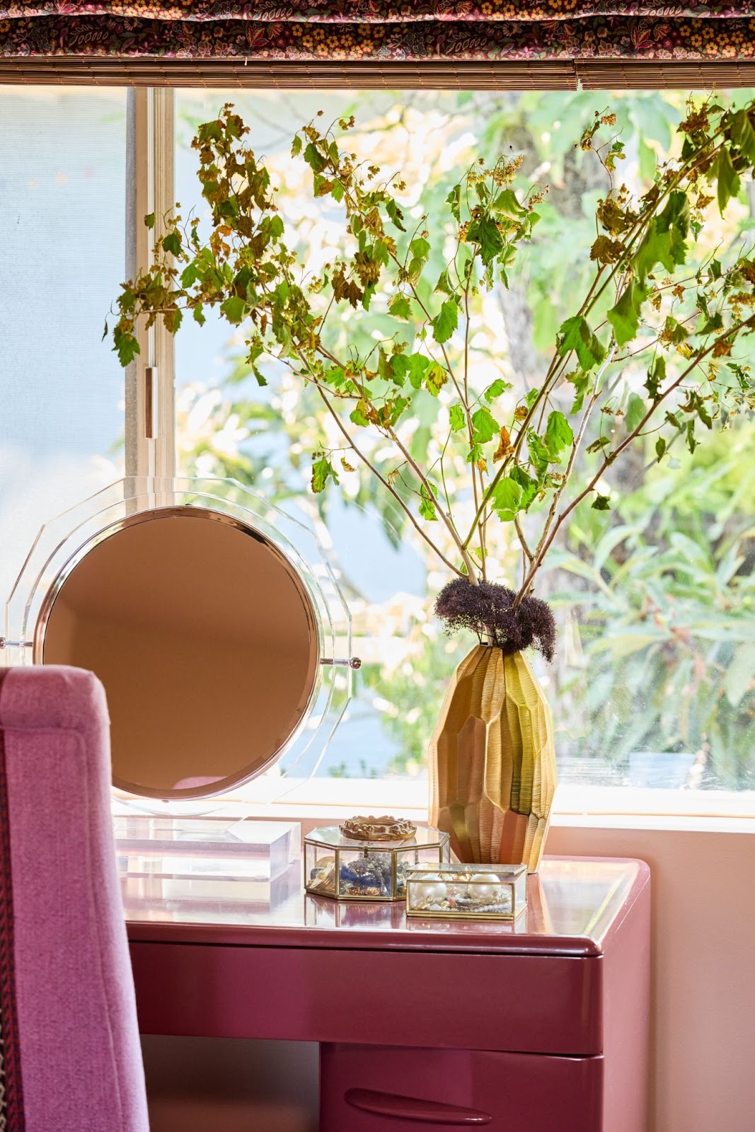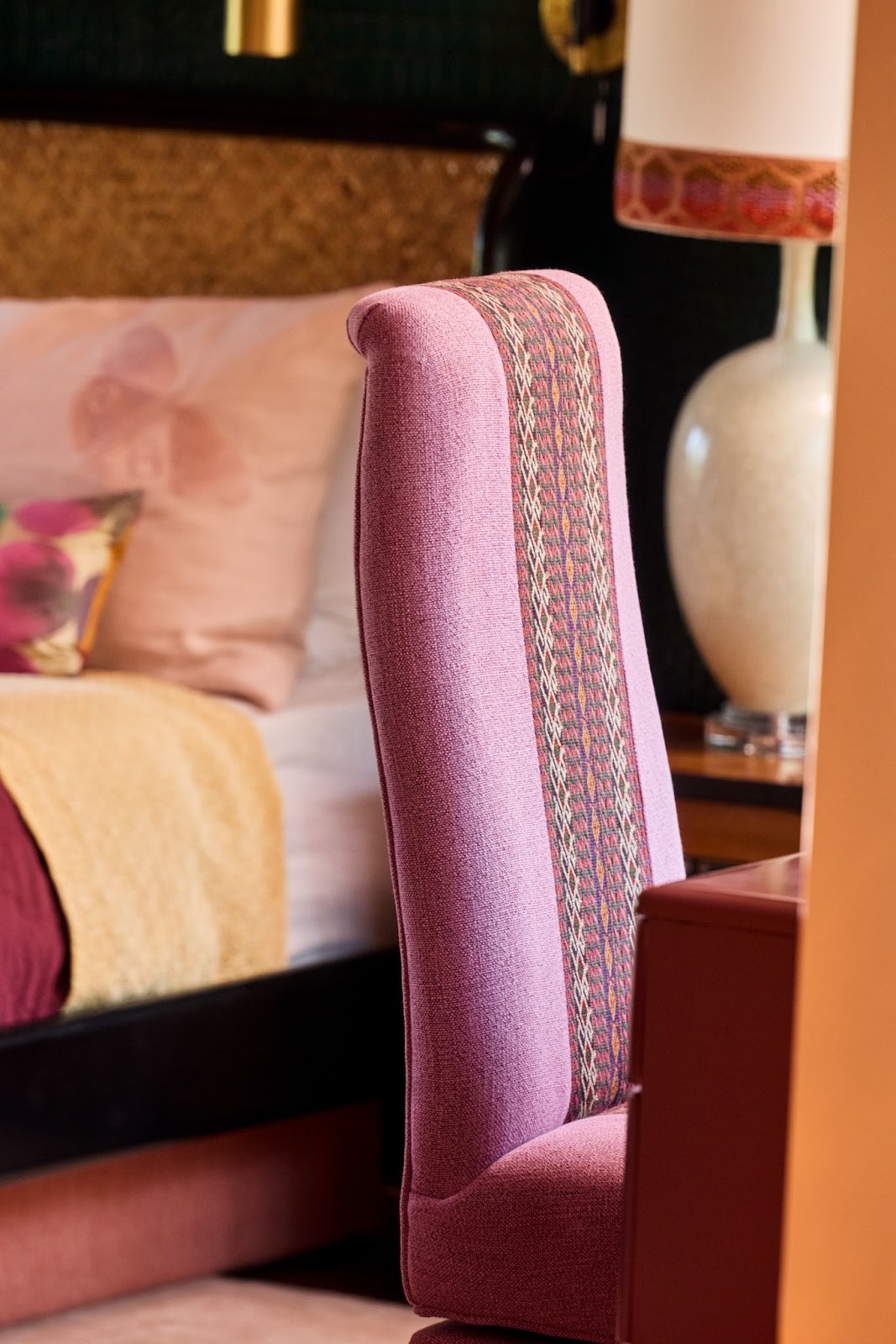Our room blends decades and details: a flea market vanity chair upholstered in luxe Kravitz fabric, a restored dressing table with fresh lacquered paint, and custom lamps that nod to mid-century glam. The balance keeps the room from feeling overly polished and more curated and collected.