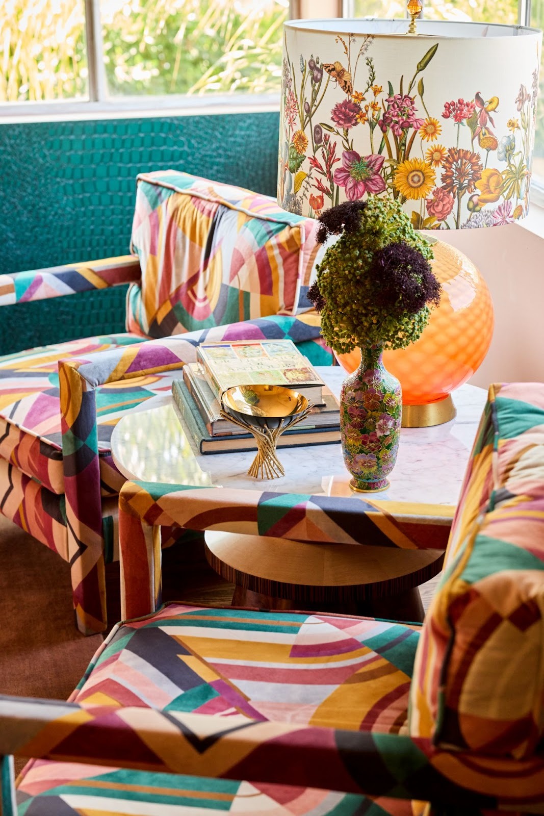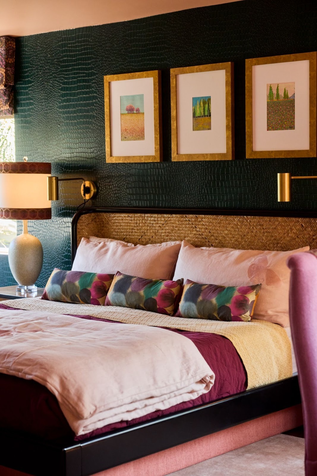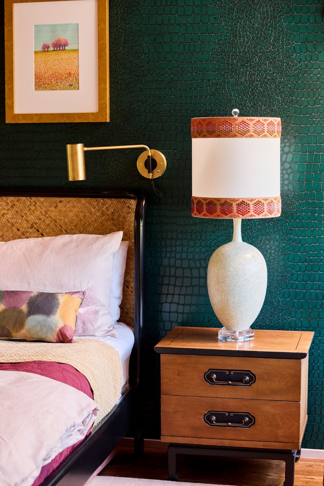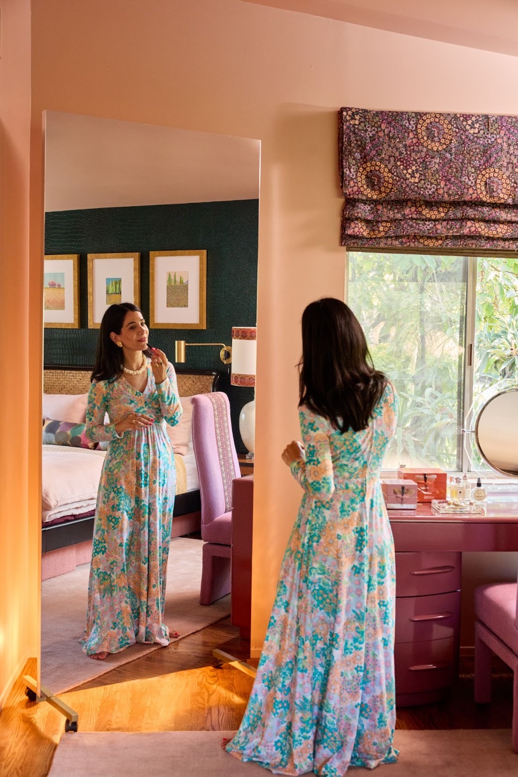 Our room blends decades and details: a flea market vanity chair upholstered in luxe Kravitz fabric, a restored dressing table with fresh lacquered paint, and custom lamps that nod to mid-century glam. The balance keeps the room from feeling overly polished and more curated and collected.