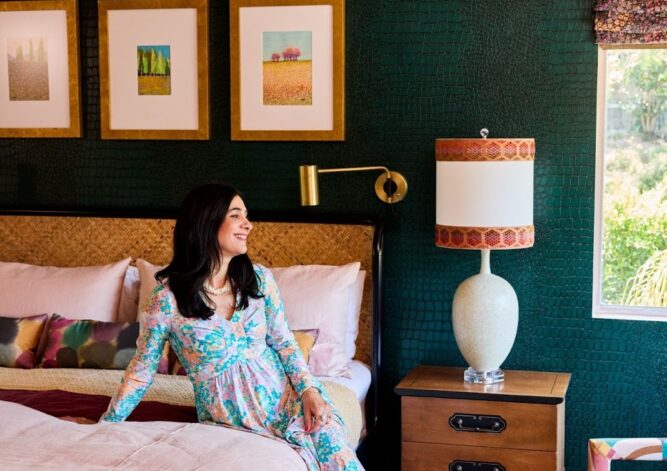 Our room blends decades and details: a flea market vanity chair upholstered in luxe Kravitz fabric, a restored dressing table with fresh lacquered paint, and custom lamps that nod to mid-century glam. The balance keeps the room from feeling overly polished and more curated and collected.